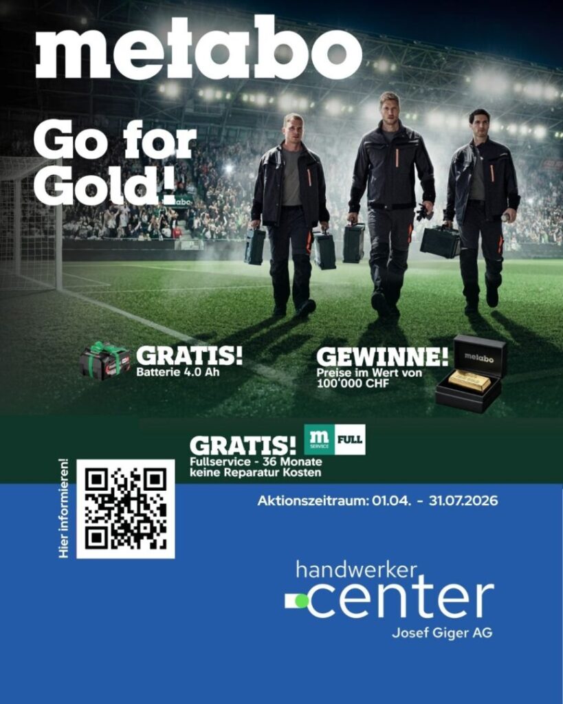Kaufe ein Aktionsgerät und erhalte den Metabo Li-POWER 4.0Ah gratis dazu! Zusätzlich lohnt es sich gleich doppelt: Neben dem Gratis-Akkupack sicherst du dir automatisch auch die Chance auf attraktive Preise bei der großen Metabo WM-Verlosung. Einfach im Zeitraum vom 01.04. bis 31.07.2026 ein teilnehmendes Aktionsgerät kaufen, mit Kaufbeleg innerhalb von 4 Wochen registrieren – und mit etwas Glück zusätzlich groß absahnen!